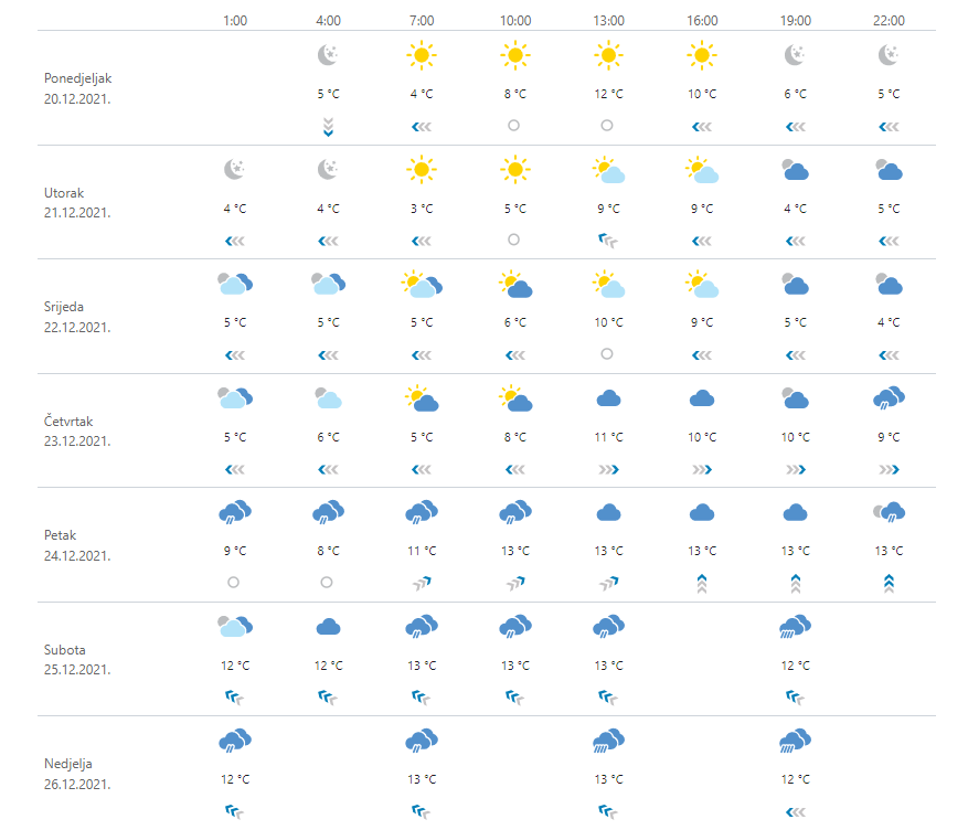 U utorak djelomice ili pretežno sunčano. Ujutro na kopnu mjestimice magla. Poslijepodne na zapadu porast naoblake. Vjetar većinom slab, a u Slavoniji još povremeno umjeren sjeverozapadnjak. Na Jadranu umjerena do jaka bura u slabljenju, a krajem dana na sjevernom dijelu jugo. Minimalna temperatura zraka od -6 do -1, na Jadranu od 2 do 7, a maksimalna uglavnom između 1 i 3, na Jadranu 6 i 10 °C.