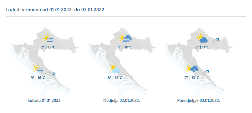 Na prvi dan 2022. godine prevladavat će sunčano te i dalje razmjerno toplo. Mjestimice jutarnja magla i niski oblaci, češći i dugotrajni ponegdje na zapadnoj obali Istre te u središnjim predjelima. Vjetar većinom slab, na moru umjeren sjeverozapadni. Jutarnja temperatura od 0 do 5, na Jadranu od 6 do 11. Najviša dnevna od 12 do 16 °C, uz dugotrajnu maglu ponegdje niža.