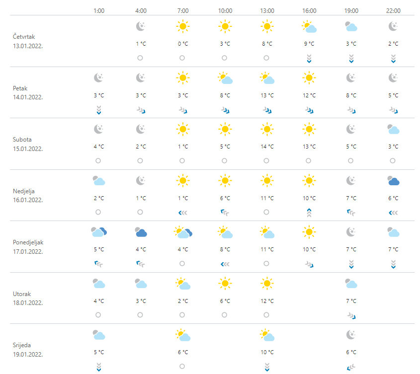 U petak pretežno sunčano i danju u unutrašnjosti osjetno toplije. Vjetar slab, na istoku i na Jadranu do umjeren sjeverozapadni, prema otvorenom moru lokalno moguće s jakim udarima. U noći i ujutro duž obale mjestimice slaba do umjerena bura. Najniža temperatura zraka od -6 do -2, na Jadranu od 2 do 6 °C. Najviša između 6 i 10, na Jadranu i u unutrašnjosti Dalmacije od 11 do 15 °C.