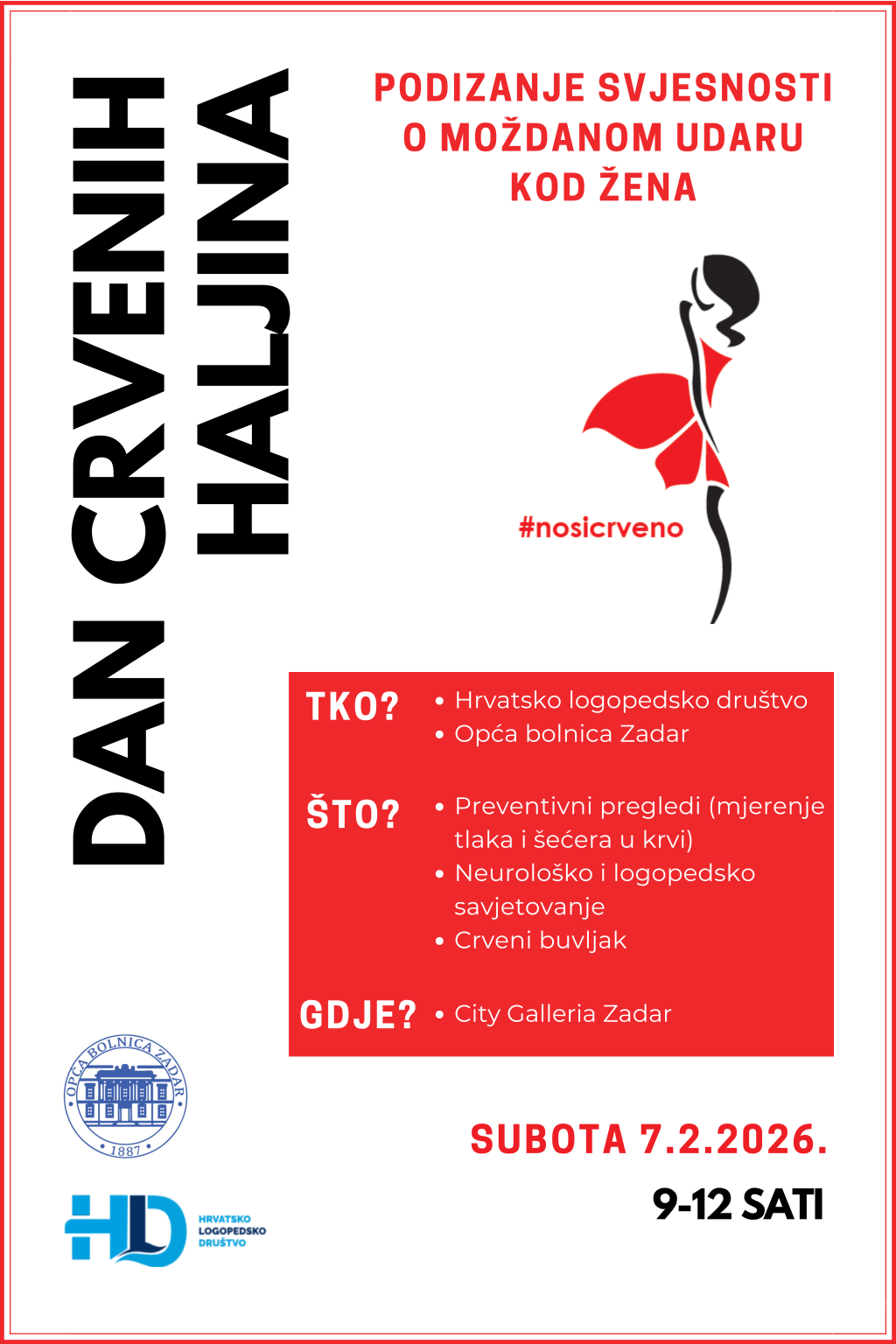 Podružnica Zadarske županije Hrvatskog logopedskog društva (HLD) i Odjel neurologije Opće bolnice Zadar organiziraju javnozdravstvenu akciju povodom obilježavanja Dana crvenih haljina, kampanje usmjerene na prevenciju, rano prepoznavanje i pravodobno liječenje moždanog udara u žena.