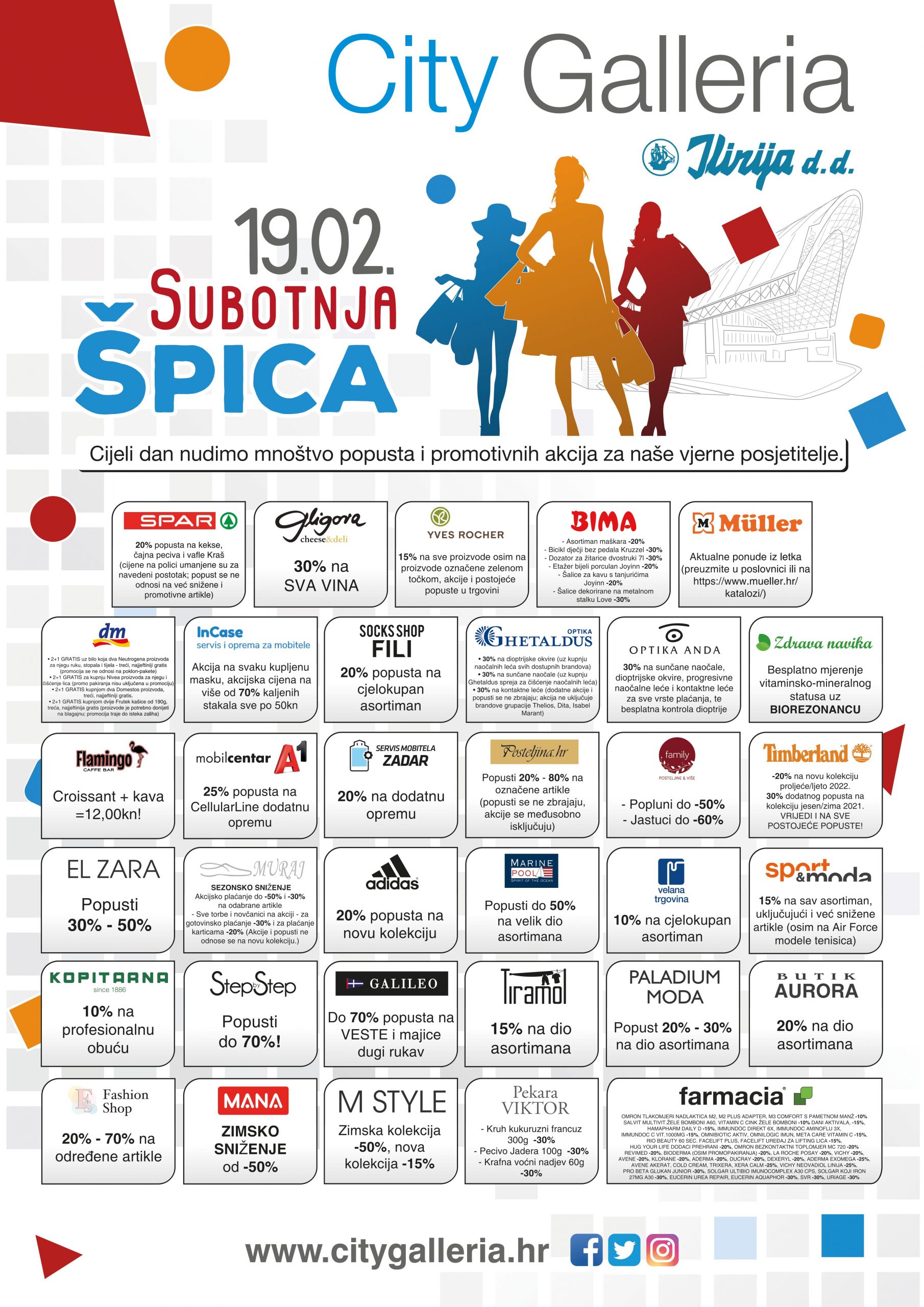 Posjetite nas i ovu subotu, 19. veljače 2022. godine, jer vas u centru City Galleria čeka još jedna subotnja špica sa mnoštvom promotivnih akcija i popusta u trgovinama centra.
