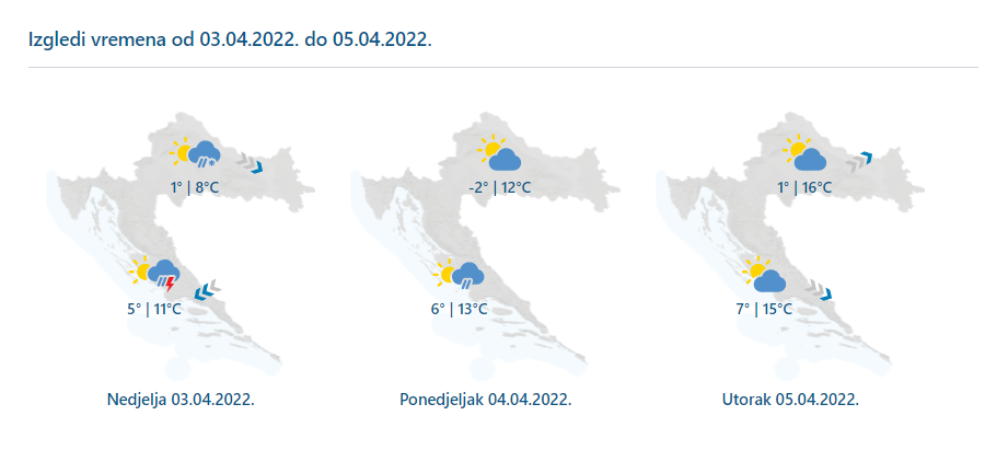 U nedjelju postupno smirivanje u većini predjela, bit će umjereno, početkom dana još i pretežno oblačno, u unutrašnjosti ponegdje s malo kiše i susnježice, u gorju i snijega, a jugu i uz poneki pljusak praćen grmljavinom. Pljuskova će na krajnjem jugu biti i u ponedjeljak, drugdje suho i bar djelomice sunčano. Ujutro mjestimice može biti magle, ponajviše na kopnu u uglavnom sunčani utorak prije zatopljenja i jačanja jugozapadnjaka. Vjetar do tada na kopnu slab ili umjeren sjeverozapadni, na moru u nedjelju bura, na sjevernom Jadranu i jaka i brzo će oslabjeti. Temperatura zraka u porastu, jutra svježa, u unutrašnjosti i hladna, u ponedjeljak te moguće još ponegdje i u utorak slab mraz.