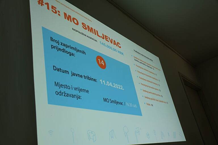 Zainteresirani građani koji su se odazvali na javne tribine raspravljali su i odlučivali o prioritetnim malim investicijama u svojim mjesnim odborima. Na raspolaganju je bilo 145.000,00 kuna za MO Smiljevac i 175.000,00 kn za MO Stanovi. Cjelokupna alokacija za jedan i drugi mjesni odbor je utrošena.