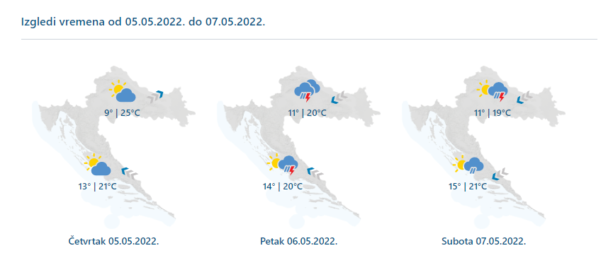 Djelomice sunčano uz promjenjivu naoblaku. U četvrtak samo ponegdje malo kiše, uglavnom u gorju i na zapadu. U petak promjenljivo, na zapadu unutrašnjosti gdje će kiša biti česta i pretežno oblačno, lokalno će biti izraženijih pljuskova praćenih grmljavinom. U subotu i dalje nestabilno, uz više sunčanih razdoblja osobito u drugom dijelu dana. Puhat će umjeren jugozapadnjak i jugo, od petka sjeverni vjetar na kopnu i bura na sjevernom Jadranu koja će u subotu zapuhati i u Dalmaciji. Temperatura na moru bez veće promjene, a na kopnu od petka danju svježije.