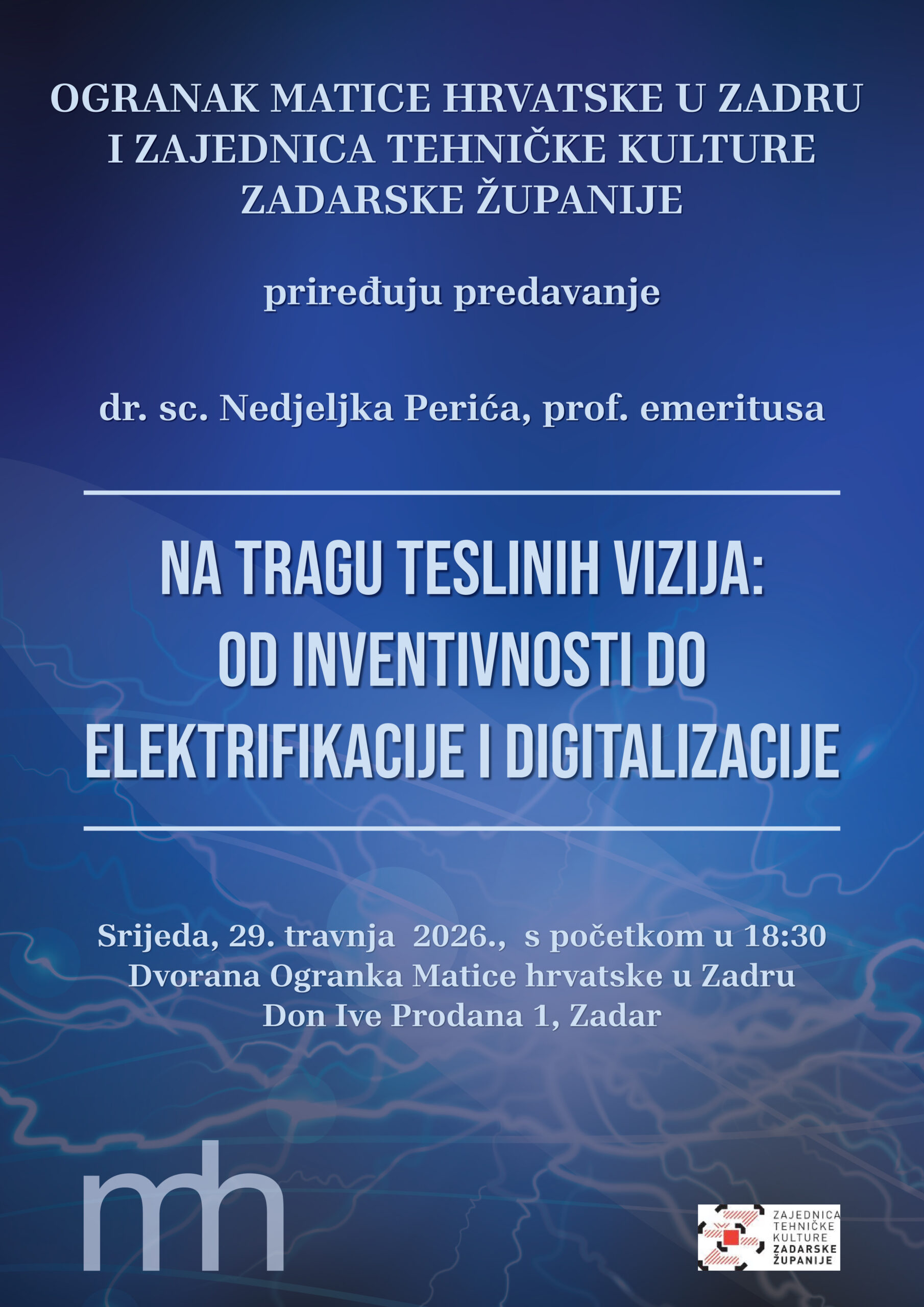 Ogranak Matice hrvatske u Zadru i Zajednica tehničke kulture Zadarske županije priređuju predavanje dr. sc. Nedjeljka Perića, prof. emeritusa: „Na tragu Teslinih vizija: od inventivnosti do elektrifikacije i digitalizacije”.