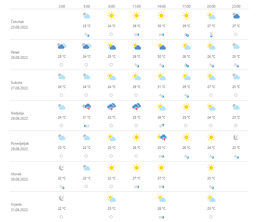U unutrašnjosti promjenljivo i nestabilno, mjestimice uz kišu, u popodnevnim satima lokalno moguće i pljuskove praćene grmljavinom. Ujutro je ponegdje moguća magla, osobito po kotlinama i uz rijeke. Na Jadranu će prevladavati sunčano, no uz povremeno više oblaka u nedjelju raste vjerojatnost za lokalne pljuskove i grmljavinu. Na kopnu vjetar većinom slab, u nedjelju do umjeren jugozapadni. Na Jadranu u noći i ujutro slaba do umjerena bura, a danju sjeverozapadnjak, uz obalu ponegdje i zapadnjak te jugozapadnjak, u nedjelju pak okreće na jugo. Temperatura zraka bez znatnije promjene, danju vrlo toplo, na obali i vruće.