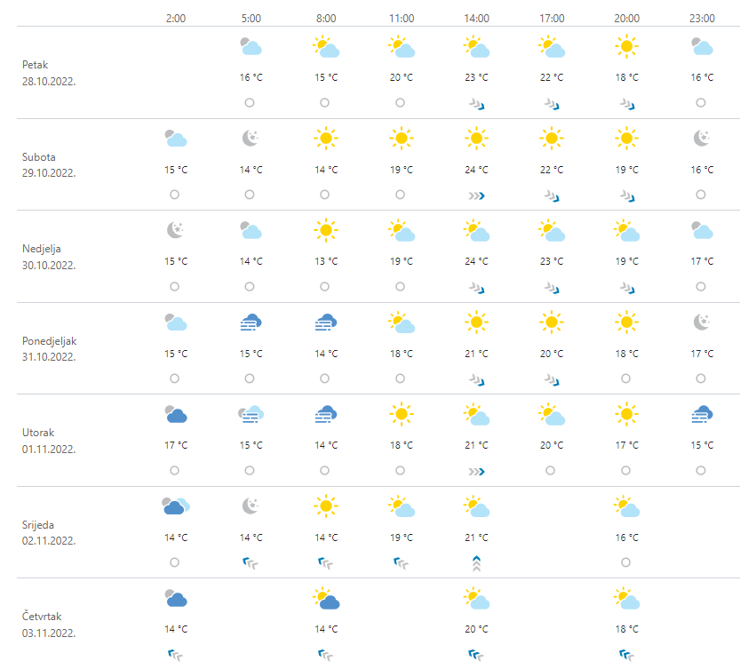 Stabilno i iznadprosječno toplo, a osobito na Jadranu i sunčano. U unutrašnjosti u prvom dijelu dana mjestimice magla i niski oblaci koji se još u subotu lokalno mogu i dulje zadržati i tako značajno utjecati na porast temperature zraka. Kratkotrajne magle u jutarnjim satima može biti i uz obalu, osobito sjevernoga Jadrana. Vjetar slab, na moru ponegdje umjeren sjeverozapadni. Temperatura zraka sljedećih dana bez veće promjene.