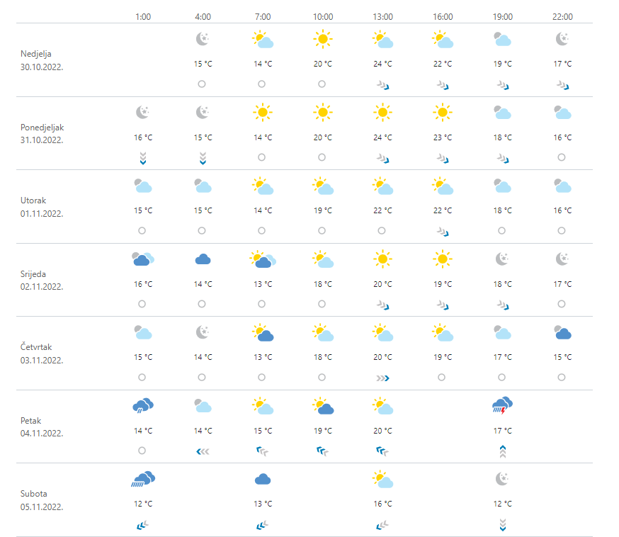 Danas u nizinama unutrašnjosti ujutro i prijepodne magla i niski oblaci, ponegdje uz slabu rosulju, a poslijepodne mjestimice sunčana razdoblja. Na Jadranu i u gorju pretežno sunčano. Vjetar slab, a na Jadranu prema otvorenom moru povremeno umjeren sjeverozapadnjak. Najviša dnevna temperatura zraka većinom između 17 i 20 °C, i to osobito u gorju, dok će u predjelima s dugotrajnom maglom biti niža. Na Jadranu maksimalna uglavnom između 23 i 26 °C.