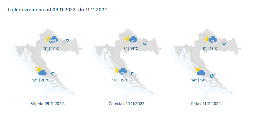 U srijedu djelomice sunčano s promjenljivom naoblakom, u prvom dijelu dana u unutrašnjosti s maglom. Poslijepodne i navečer u Gorskom kotaru te na širem riječkom području mjestimična kiša. U četvrtak jače naoblačenje, uglavnom u unutrašnjosti i na sjevernom dijelu Jadrana s kišom, najprije u zapadnim, a do kraja dana i u istočnim predjelima, moguće i na sjeveru Dalmacije. U petak na Jadranu razvedravanje, samo mjestimice uz malo kiše, a u unutrašnjosti promjenljivo oblačno sa sunčanim razdobljima te s kišom uglavnom ponegdje na istoku gdje će se zadržati najoblačnije. Puhat će slab i umjeren jugozapadni vjetar, od četvrtka sjeverni i sjeverozapadni. Na Jadranu jugo, krajem četvrtka na sjevernom dijelu okrenut će na buru koja će u petak jačati. Temperatura na Jadranu bez veće promjene, u unutrašnjosti u srijedu u porastu, a od četvrtka malo niža.