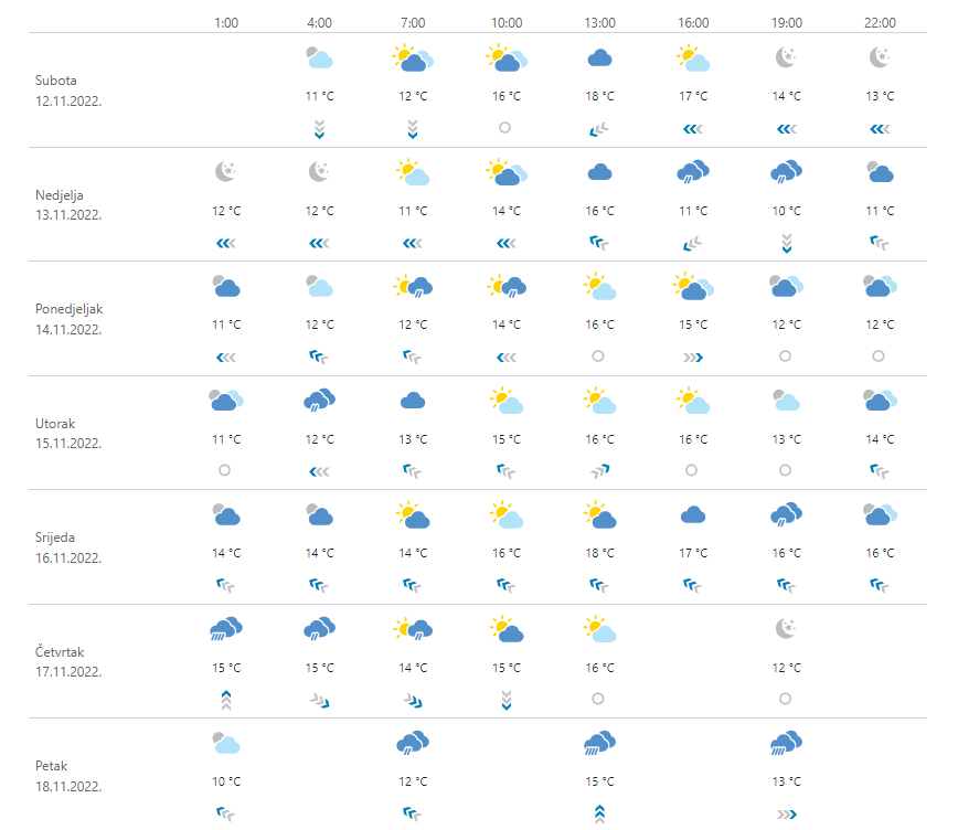 U unutrašnjosti u nedjelju i ponedjeljak umjereno do pretežno oblačno, a mjestimice malo kiše uglavnom u gorskim predjelima. U utorak djelomice sunčano. Jutra maglovita i svježa. Vjetar većinom slab, u nedjelju istočni, a u utorak jugozapadni. Prema kraju razdoblja porast najviše dnevne temperature zraka. Na Jadranu djelomice sunčano, osobito na sjevernom dijelu. U Dalmaciji će uz više oblaka u drugom dijelu nedjelje i u ponedjeljak mjestimice biti kiše. U nedjelju na sjevernom dijelu vrlo jaka bura, a u Dalmaciji popodne pak jak istočni vjetar i jugo. Od ponedjeljka uglavnom umjereno jugo. Temperatura zraka bez veće promjene.