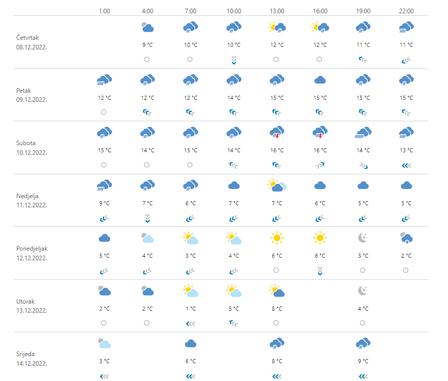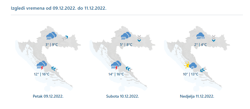 Oblačno uz povremeno obilnu kišu, osobito duž obale, u unutrašnjosti Dalmacije i u gorskim područjima te uz lokalno izražene pljuskove s grmljavinom. U nedjelju će uz zahladnjenje na kopnu kiša prijeći u susnježicu i snijeg, već u noći u gorju. Na kopnu će umjeren jugoistočnjak i jugozapadnjak u subotu okrenuti na sjeverac i sjeveroistočnjak, u nedjelju mjestimice jak. Na Jadranu će puhati jako i olujno jugo, a u subotu popodne će na sjevernom dijelu okrenuti na buru, u nedjelju i u Dalmaciji. Petak i subota iznadprosječno topli uz južinu, a u nedjelju zahladnjenje.