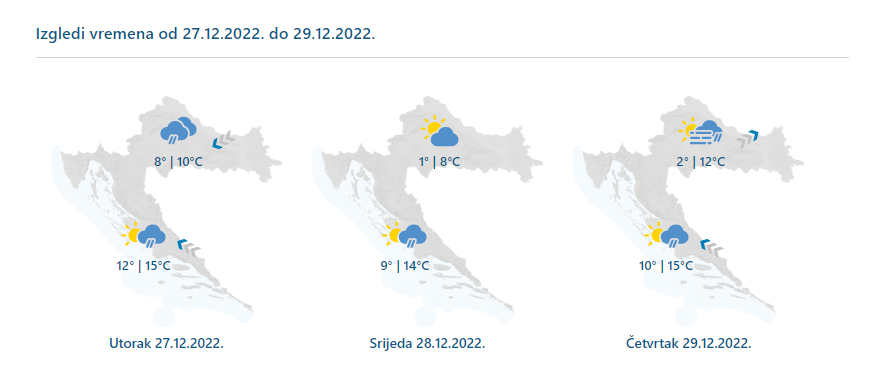 U utorak pretežno oblačno, povremeno s kišom. Najmanje kiše ili većinom suho bit će na jugu zemlje uz kraća sunčana razdoblja. Vjetar slab do umjeren sjeveroistočni, na Jadranu umjereno jugo u slabljenju, a krajem dana na sjevernom dijelu umjerena do jaka bura. Temperatura zraka na kopnu uglavnom od 8 do 12 °C, a navečer hladnije. Na Jadranu najniža jutarnja temperatura između 10 i 14, a najviša dnevna 13 i 17 °C.