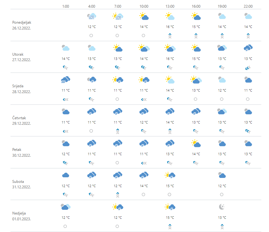 Umjereno i pretežno oblačno, uglavnom na Jadranu i u gorju mjestimice s kišom, a u utorak će kiše biti i u središnjim i istočnim predjelima. U srijedu i četvrtak u unutrašnjosti mjestimice magla, osobito ujutro. Vjetar na kopnu u utorak do umjeren sjeveroistočni, a u četvrtak jugozapadni. Na Jadranu slabo i umjereno jugo, a na sjevernom Jadranu u utorak i bura, u četvrtak i jugozapadnjak. I dalje toplije od prosjeka.