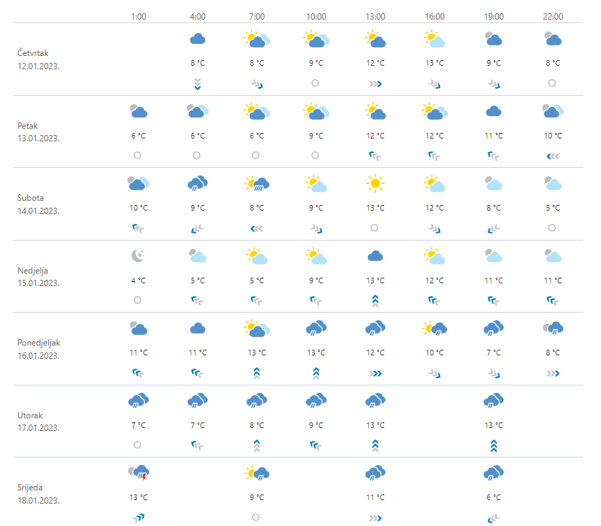 Danas u prvom dijelu dana umjereno do pretežno oblačno povremeno s kišom, u višem gorju susnježicom i snijegom, a uglavnom suho bit će na jugu. Od sredine dana prestanak oborina i razvedravanje sa zapada pa će poslijepodne u većini krajeva prevladavati sunčano. Vjetar uglavnom slab, na Jadranu slaba i umjerena bura i sjeverozapadnjak. Najviša dnevna temperatura između 6 i 10, na Jadranu od 10 do 14 °C.