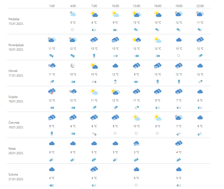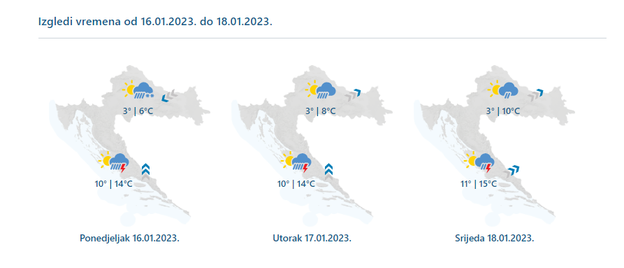 Danas djelomice sunčano uz postupan porast naoblake sa zapada. Mjestimična kiša na sjevernom Jadranu i u Gorskom kotaru već prijepodne, a češća prema kraju dana. Navečer i u noći na ponedjeljak kiša i u Lici te u središnjim predjelima, a s padom temperature u višem gorju susnježica i snijeg. Ujutro mjestimice u unutrašnjosti magla. Puhat će slab do umjeren, ponegdje i jak jugozapadnjak, a na Jadranu jugo. Najviša dnevna temperatura uglavnom od 10 do 15 °C.