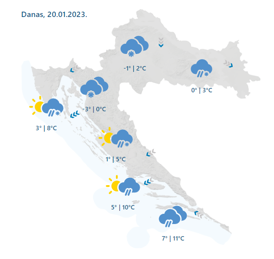 Danas umjereno do pretežno oblačno, mjestimice sa slabim oborinama. Na Jadranu povremeno kiša, u unutrašnjosti snijeg, i to ponajprije u gorju, a susnježice i snijega nošenog jakim vjetrom može biti i uz obalu. Vjetar slab do umjeren sjeveroistočni i sjeverozapadni. Na Jadranu umjerena do jaka, na udare i olujna bura, a na jugu jako jugo koje će krajem dana okrenuti na buru. Najviša dnevna temperatura zraka od -1 do 3, a na Jadranu između 6 i 11 °C.