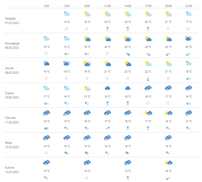U unutrašnjosti u ponedjeljak mjestimice kiša ili pljuskovi. U utorak promjenljivo oblačno i uglavnom suho. U srijedu kiša, pljuskovi i grmljavina, osobito u gorju i u unutrašnjosti Dalmacije. U ponedjeljak će puhati slab do umjeren sjeveroistočnjak. U utorak vjetar većinom slab, a u srijedu uglavnom u Slavoniji umjeren jugoistočnjak i istočnjak. Osjetno svježije nego u dane vikenda. Na Jadranu u ponedjeljak i utorak promjenljivo oblačno, a kiša je moguća lokalno na sjevernom Jadranu. U srijedu pretežno oblačno s kišom, pljuskovima i grmljavinom. U ponedjeljak će puhati slab do umjeren jugozapadnjak i jugo, u utorak većinom sjeverozapadnjak i bura, a u srijedu u Dalmaciji umjereno do jako jugo. Prema sredini tjedna temperatura zraka u padu.