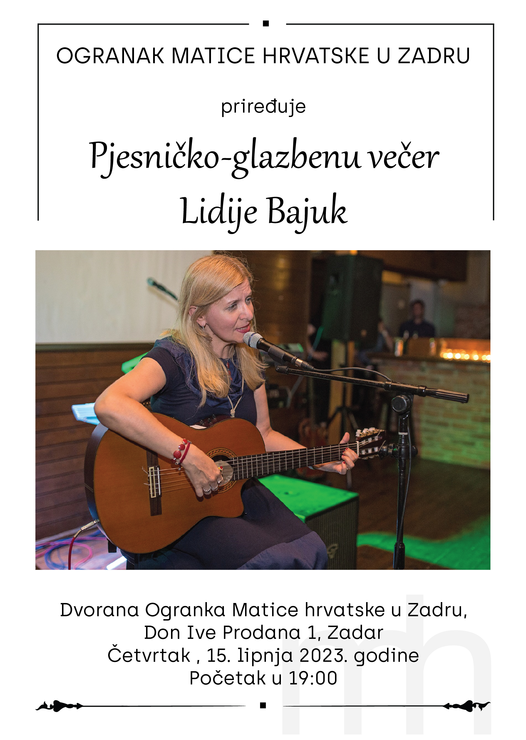 Ogranak Matice hrvatske u Zadru priređuje pjesničko-glazbenu večer Lidije Bajuk. Pjesničko-glazbeni program održat će se u Ogrankovoj dvorani, na adresi Don Ive Prodana 1, u četvrtak 15. lipnja, s početkom u 19:00.