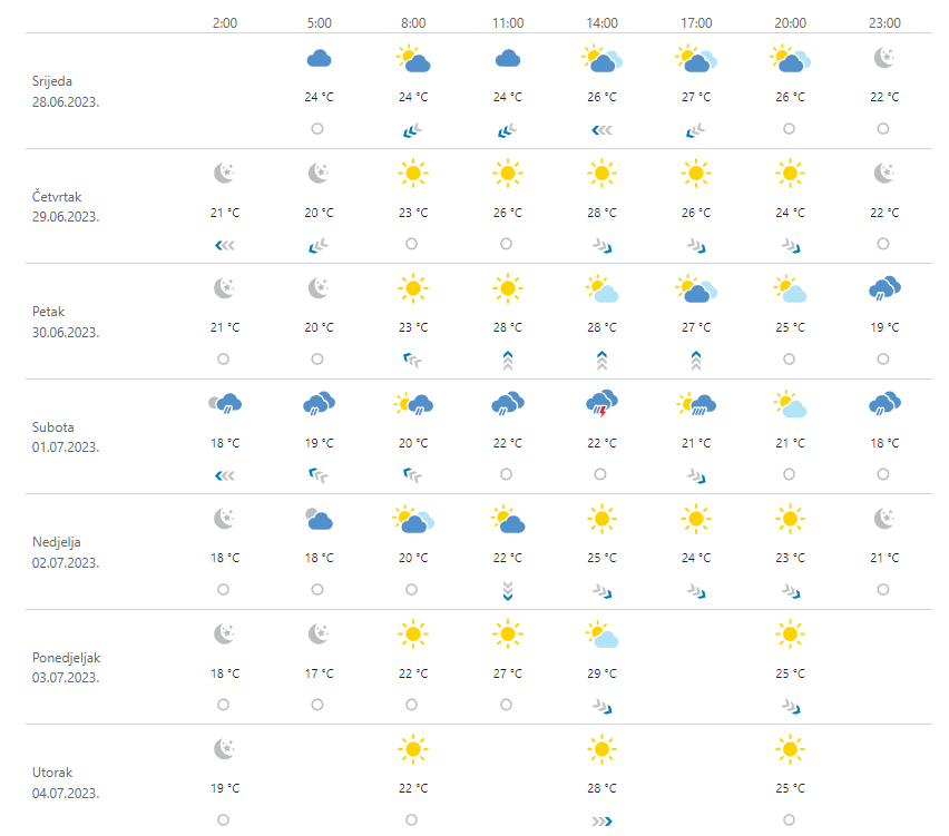 Danas u unutrašnjosti u prvom dijelu dana pretežno oblačno s mjestimičnom kišom. Zatim razvedravanje, no još ponegdje može pasti poneki pljusak. Na Jadranu promjenljivo oblačno, u Dalmaciji uz lokalne pljuskove s grmljavinom, ujutro i na sjevernom Jadranu. Vjetar slab do umjeren sjeverni i sjeveroistočni. Na Jadranu umjerena bura, prijepodne podno Velebita jaka s olujnim udarima, a na jugu jugozapadnjak i jugo. Najviša dnevna temperatura zraka većinom od 20 do 24, a na Jadranu od 25 do 29 °C.