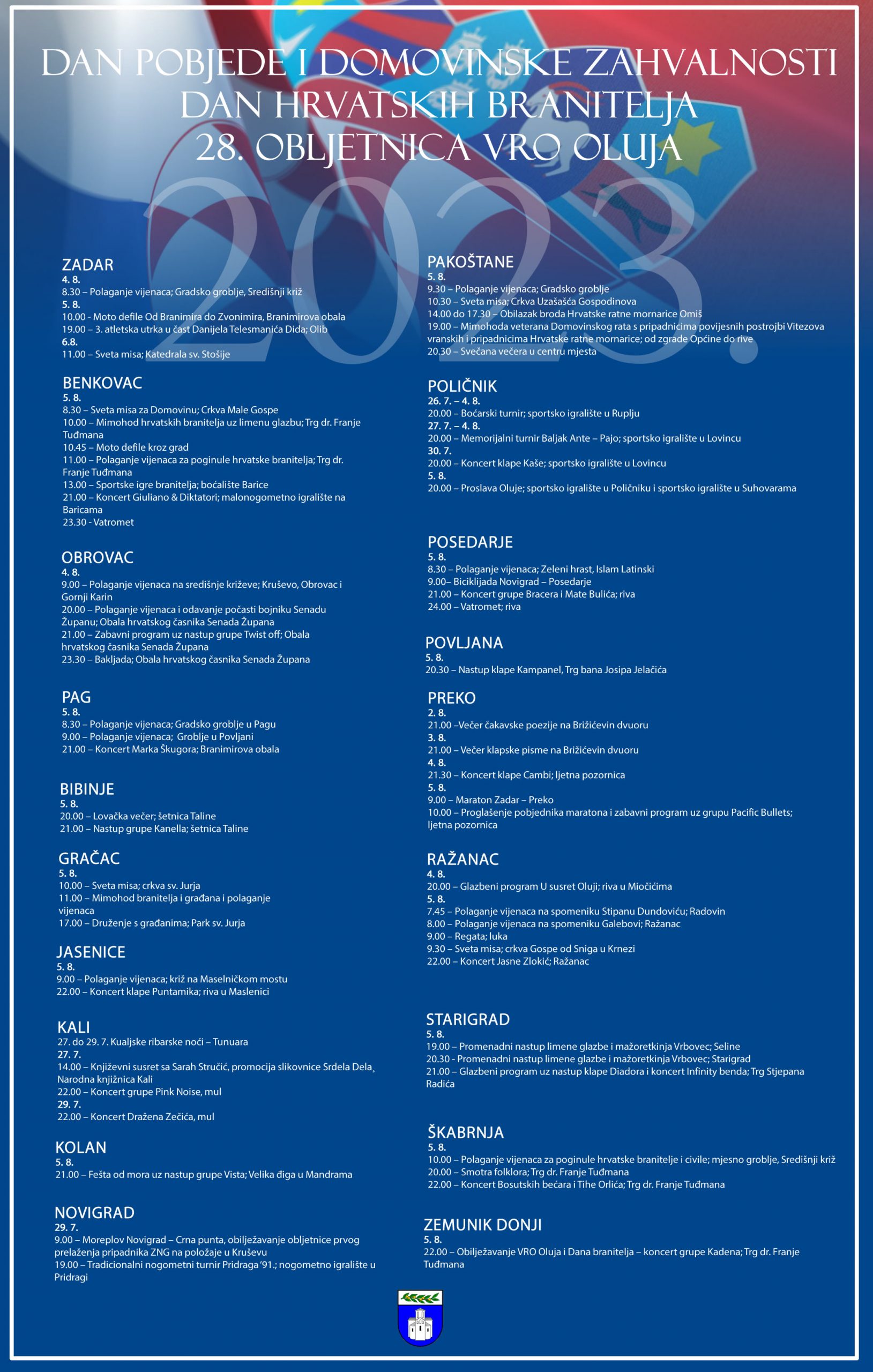 20.00 – Proslava Oluje; sportsko igralište u Poličniku i sportsko igralište u Suhovarama
