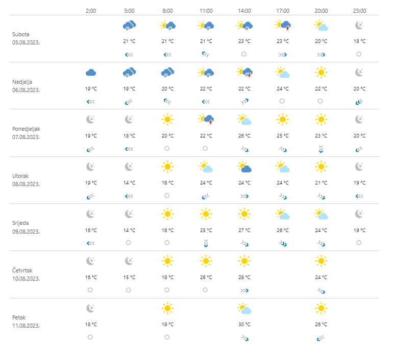 Danas umjereno do pretežno oblačno uz mjestimičnu kišu i pljuskove s grmljavinom, obilnije i izraženije u prvom dijelu dana, a lokalno je moguće i grmljavinsko nevrijeme, osobito u Dalmaciji. Sredinom dana i poslijepodne na Jadranu i predjelima uz njega češća sunčana razdoblja, no i dalje ponegdje kiša i pljuskovi. Vjetar slab do umjeren sjeveroistočni i sjeverni, lokalno i jak, poslijepodne zapadni i jugozapadni. Na Jadranu podno Velebita ujutro bura, zatim umjeren i jak sjeverozapadnjak, u Dalmaciji umjereno i jako jugo i južni vjetar. Najviša dnevna temperatura zraka uglavnom od 20 do 24, na Jadranu između 24 i 28 °C.