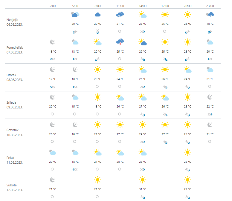 Danas promjenljivo oblačno, osobito na Jadranu sa sunčanim razdobljima. Povremeno s kišom te pljuskovima s grmljavinom, lokalno moguće izraženim. Vjetar slab do umjeren jugozapadni i sjeverozapadni, na istoku prolazno i jak. Na Jadranu umjeren, ponegdje i jak sjeverozapadnjak, uz obalu i jugozapadnjak, prolazno u okretanju na jugo i sjeverni. Najviša dnevna temperatura zraka između 19 i 24, na Jadranu od 24 do 28 °C.