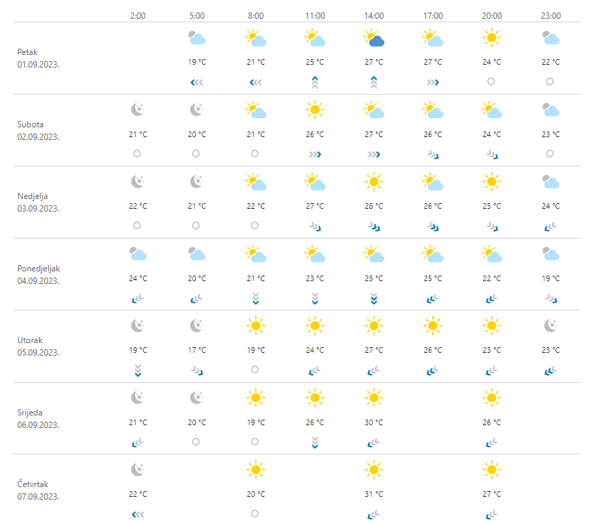 Djelomice i pretežno sunčano, uglavnom stabilno, Vjetar slab, u ponedjeljak umjeren sjeverni i sjeveroistočni. Na Jadranu umjeren jugozapadni i sjeverozapadni, ujutro prolazno burin, a u ponedjeljak će zapuhati jaka bura. Temperatura zraka u porastu, vrlo toplo i vruće.