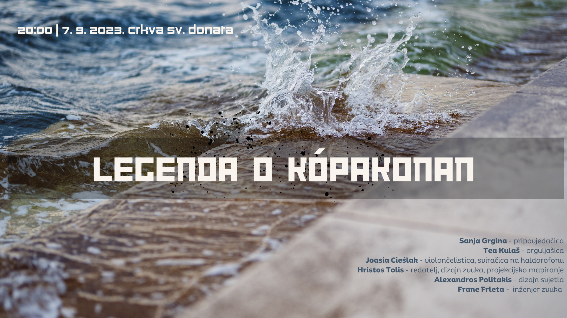 Večeras u 20 sati, crkva sv. Donata postaje pozornica za jedinstveni događaj osmišljen kako bi uronio publiku u čarobni svijet jedne od najljepših europskih legendi. Ne, nije to običan koncert. Priča, glazba, slika, zvuk i svjetlosne instalacije preplavit će unutrašnjost srednjovjekovne rotonde i predstaviti legendu o Kópakonan, ženi tuljan s Farskih otoka. Ta je uzbudljiva i magična priča svojom snagom protkala mitologiju sjevernih naroda, a i danas živi na obalama hladnih sjevernih mora. Vjeruje se da su ljudi dobrovoljno dali svoj život moru i pretvorili se u tuljane, a jedna žena tuljan je svojom ljepotom očarala mladića koji je preokrenuo život kako bi saznao istinu i osvojio najljepšu od svih. Vrati li se Kópakonan u more ili odluči ostati na kopnu, saznati možete večeras iz naracije zadarske glumice, pripovjedačice i lutkarice Sanje Grgine. Njezinu će priču obogatiti glazba orguljašice i organizatorice Zadar Organ Festivala, Tee Kulaš, koja će zasvirati na prijenosnim koncertnim orguljama iz nizozemske radionice Mixtuur. Njoj će se pridružiti poljska violončelistica Joasia Cieślak čiji će prsti prebirati i po novom instrumentu vizualno nalik na električno violončelo – haldorofonu. Za ovu je priliku iz svoje kolekcije taj instrument Zadar Organ Festivalu posudio njegov izumitelj, Islanđanin Halldor Ulfarsson. Osim glazbe, atmosferu će začiniti Zadrom inspirirani zvukovi čiji je autor grčki snimatelj, filmski autor, glazbenik i multimedijalni umjetnik Hristos Tolis, ujedno i redatelj ove predstave. Za dizajn svjetla odgovoran je grčki umjetnik Alexandros Politakis.