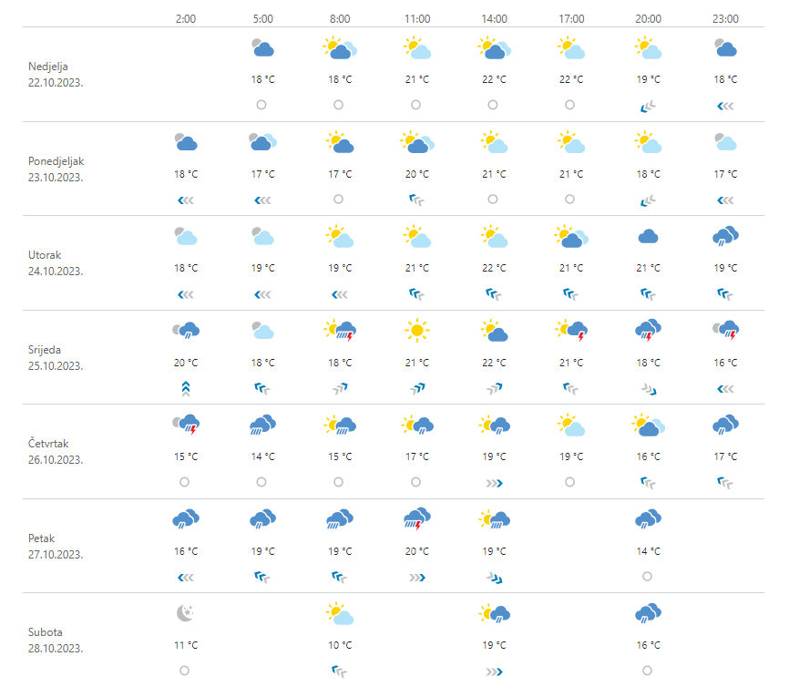 Djelomice sunčano, uz prolazno više oblaka uglavnom na sjevernom Jadranu i na otocima lokalno može pasti malo kiše. U unutrašnjosti jutro ponegdje maglovito. U utorak postupan porast naoblake, a krajem dana ponovno raste vjerojatnost za kišu na sjevernom Jadranu. U oblačniju srijedu mjestimična kiša očekuje se u cijeloj zemlji, no češća i obilnija bit će na Jadranu gdje su mogući i pljuskovi s grmljavinom. Vjetar na kopnu slab do umjeren jugozapadni i južni, od utorka na udare i jak. Na Jadranu će u utorak zapuhati umjereno i jako jugo te jačati na olujno u noći na srijedu. Tijekom srijede će slabjeti i okretati na jugozapadnjak. Iznadprosječno toplo.