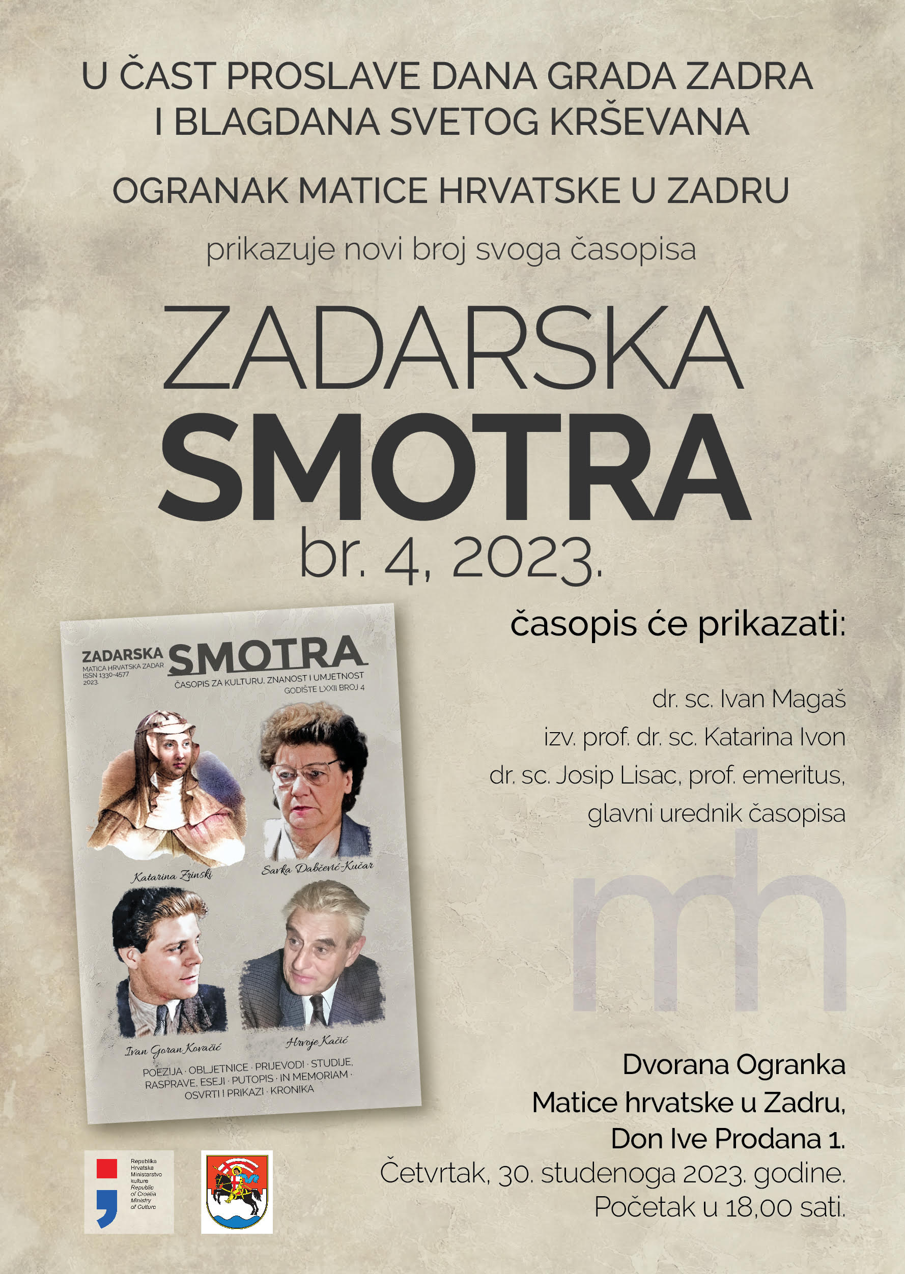 Prikaz četvrtog ovogodišnjeg broja „Zadarske smotre“ održat će se 30. studenoga 2023. godine, u dvorani Ogranka Matice hrvatske u Zadru, Don Ive Prodana 1, s početkom u 18:00.