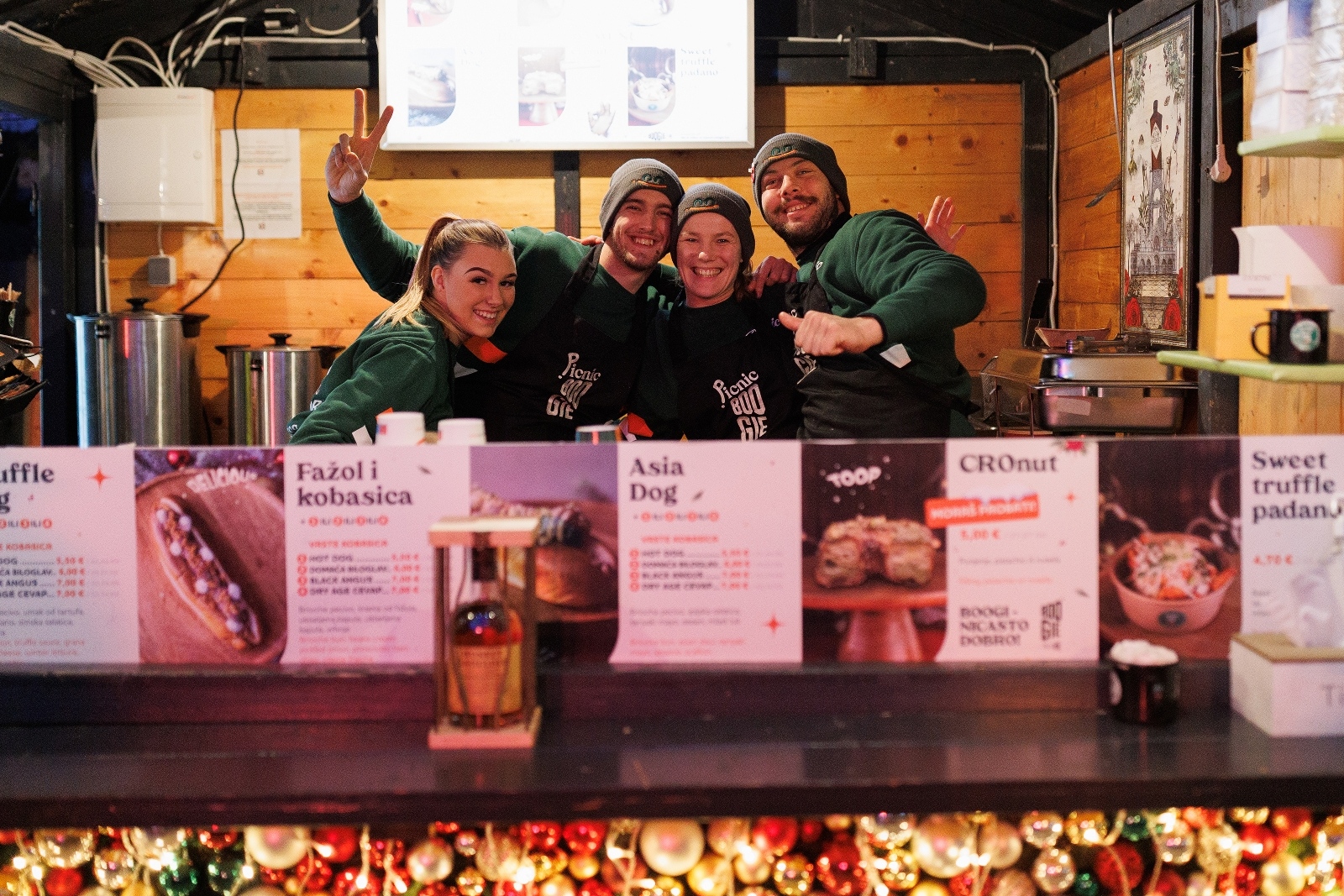 Maestro zadarskog fast fooda Vedran Božićev već se proslavio sa svojim food truckom i kućicama na zagrebačkim i zadarskim adventskim sajmovima, a u ovoj se kućici se udružio zagrebačkim Boogie Labom, svježom i vrhunskom ugostiteljskom pričom. Već i je ranija poveznica bila Kroštula artisan pekara čija su peciva, naravno, drugi najvažniji dio svih zalogaja u ponudi ove kućice. Prvi najvažniji dio je mesni sadržaj. Božićev je ovaj put umnožio ponudu na način da svatko može izabrati svoje jelo birajući između ćevapa od odležane black agnus junetine, black agnus kobasice ili domaće kobasice Biloglav, paš i hrenovke, te ih po volji kombinirati s četiri vrste originalna priloga: azijskim, s tartufima, fažolom ili sirnim od padana. Ukupno 16 kombinacija! Kulinarske kreativnosti ne nedostaje ni u slatkim jelima i coctailima: Cronut je sjajna kremasta fuzija između američke krafne i francuskog kroasana s  kremom od pistaccia i čokolade ili nutelle s prahom brusnice, a kuhani panettone je topli coctail s votkom, kamilicom i komadićem tog Kroštulinog kolača. Đumbirka i nekoliko drugih toplih coctaila se može naručiti ako vam se baš ne jede i pije istovremeno…