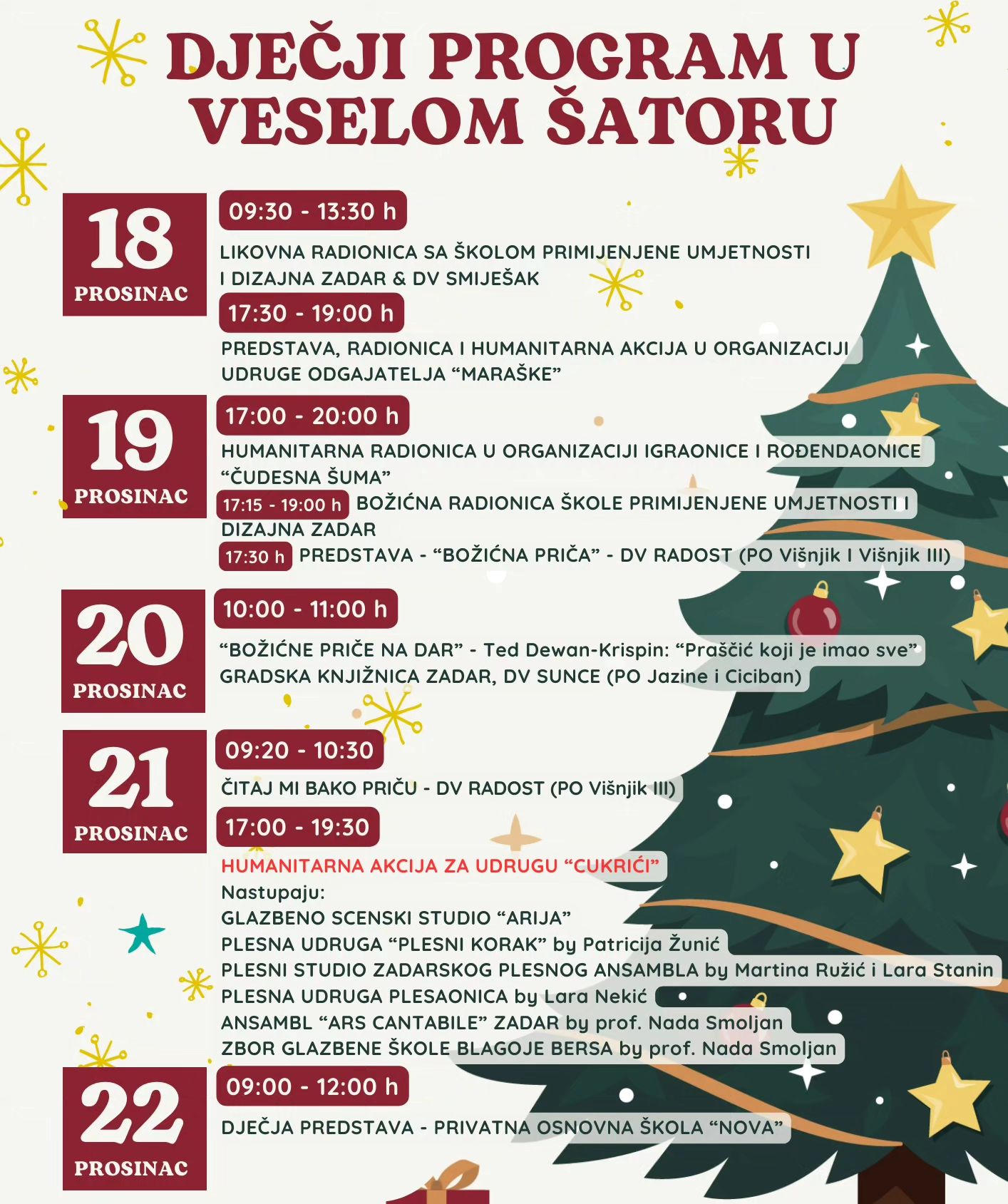 Imat ćemo priliku poslušati neke od najljepših božićnih priča, vidjeti kakve su nam to predstave pripremili mališani iz DV Radost i Privatne osnovne škole NOVA, te sudjelovati u raznim kreativnim božićnim radionicama i humanitarnim akcijama uz pjesmu i ples.