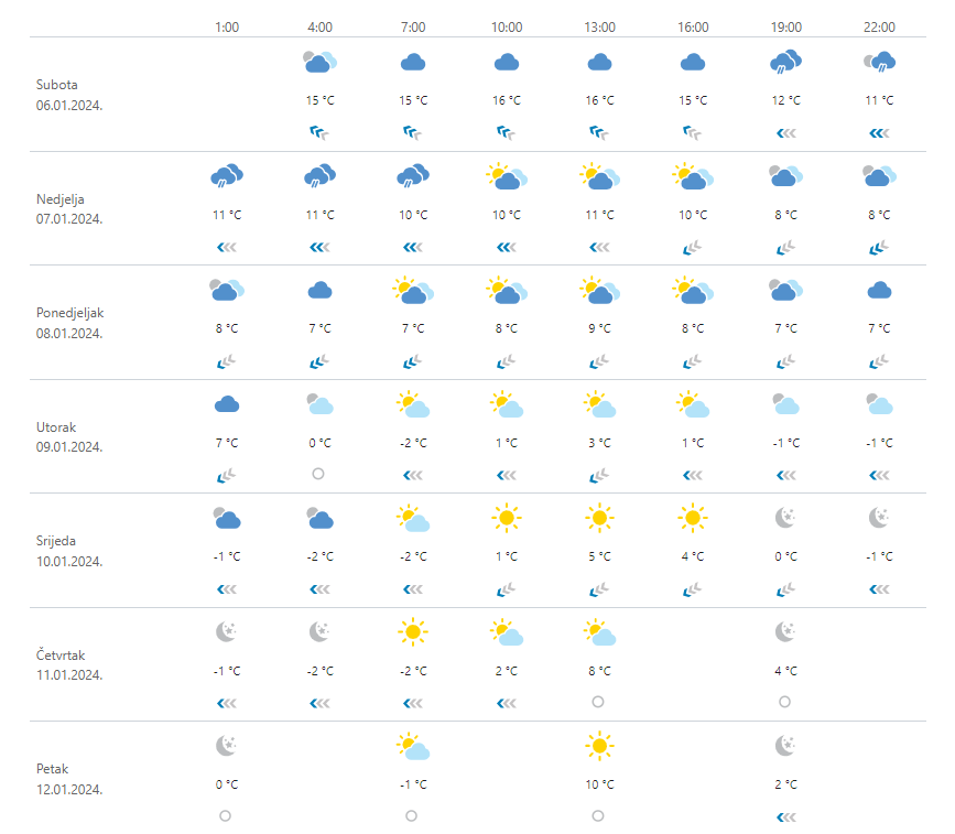 Umjereno do pretežno oblačno, povremena kiša će u nedjelju uz pad temperature zraka ponajprije u gorju prelaziti u susnježicu i snijeg, a prema večeri i u nizinama unutrašnjosti. U ponedjeljak će na kopnu povremeno padati snijeg, dok će kiše na Jadranu biti uglavnom na jugu. U utorak na Jadranu smanjenje naoblake, poneko sunčano razdoblje očekuje se i u unutrašnjosti gdje će oborina biti sve rjeđa. Puhat će većinom umjeren sjeverni i sjeveroistočni vjetar, na istoku i sjeverozapadni, osobito u nedjelju i jak, a u utorak će slabjeti. Na Jadranu bura s olujnim, podno Velebita i orkanskim udarima pa poneka pahulja snijega može pasti i uz obalu, u nedjelju će još na južnom dijelu puhati jugo. Osjetno zahlađenje.