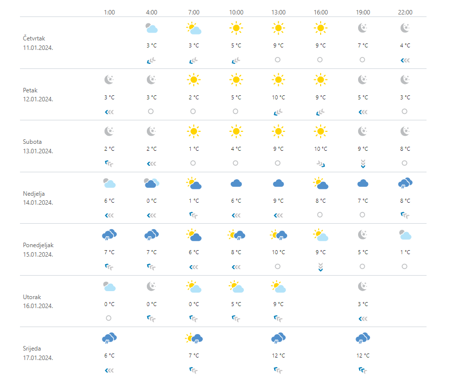 Prevladavat će sunčano. U petak u unutrašnjosti promjenljivo oblačno uz poneku pahulju snijega. U nedjelju s jugozapada postupni porast naoblake, a na Jadranu i uz njega i vjerojatnosti za malo kiše. Vjetar na kopnu većinom slab, u petak ponegdje umjeren i jak sjeverni i sjeveroistočni, a u nedjelju će u gorju jačati jugozapadnjak. Umjerena i jaka bura, pod Velebitom s olujnim udarima oslabjet će u subotu i prolazno okrenuti na sjeverozapadni vjetar, u nedjelju jugozapadni vjetar i jugo u jačanju. Jutra razmjerno hladna, dnevna temperatura bez promjene, na kopnu postupno malo viša.