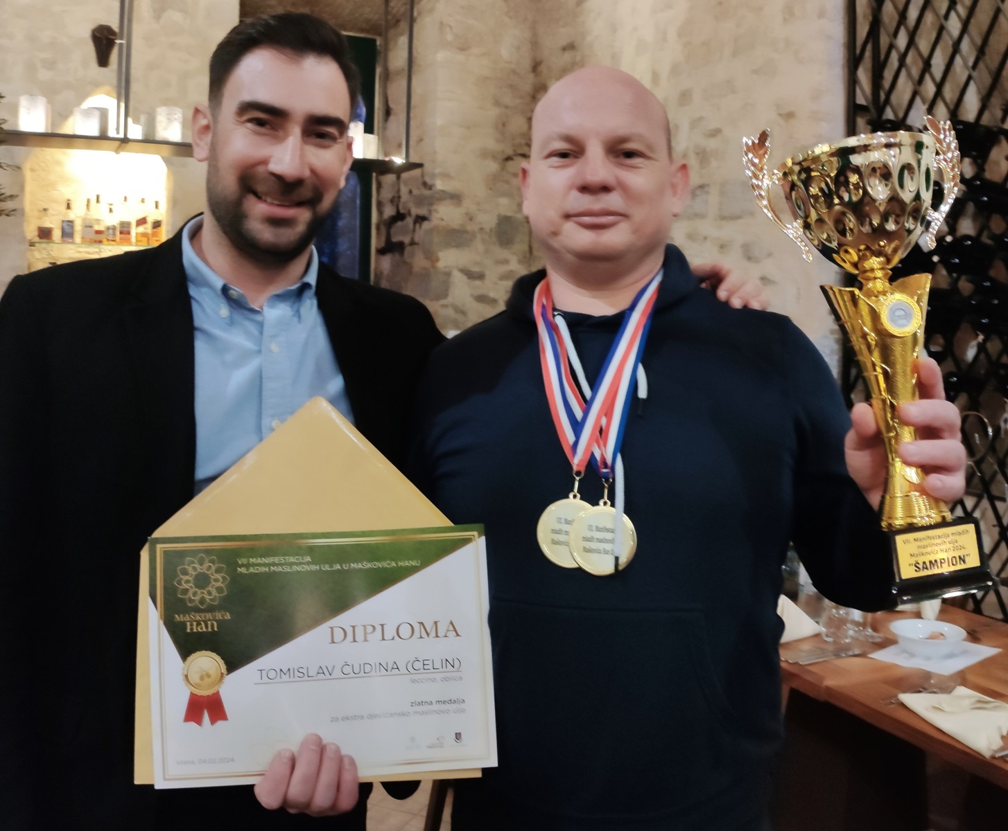 Podjelom nagrada i priznanja u baštinskom hotelu Maškovića han sinoć je završena 7. Manifestacija mladih maslinovih ulja s područja općine Pakoštane. Šampion je Tomislav Čudina Čelin, vlasnik OPG-a Čelin, a Čelin je obiteljski nadimak još iz pradjedovskih vremena. Tomislav je za svoje ulje od sorti oblica i leccino (berba 11.10. 2023.) osvojio 99,75 od mogućih 100 bodova. Uz titulu šampiona on je sa 99,40 bodova za svoje višesortno ulje od oblice, pendolina i leccina (berba 24.10. 2023., osvojio i treće mjesto na ovoj manifestaciji.