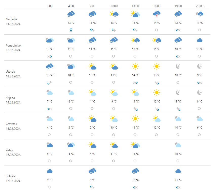Danas promjenljivo, prijepodne u većem dijelu zemlje i pretežno oblačno s povremenom kišom. Na Jadranu i krajevima uz njega mjestimice obilnija oborina te lokalno praćena grmljavinom, ponajprije u Dalmaciji. Vjetar slab do umjeren jugoistočni i jugozapadni, većinom u gorju i jak. Na moru će jako i olujno jugo i južni vjetar postupno slabjeti, najprije na sjeveru. Najviša dnevna temperatura zraka od 13 do 18 °C, u Podunavlju moguće i malo viša.
