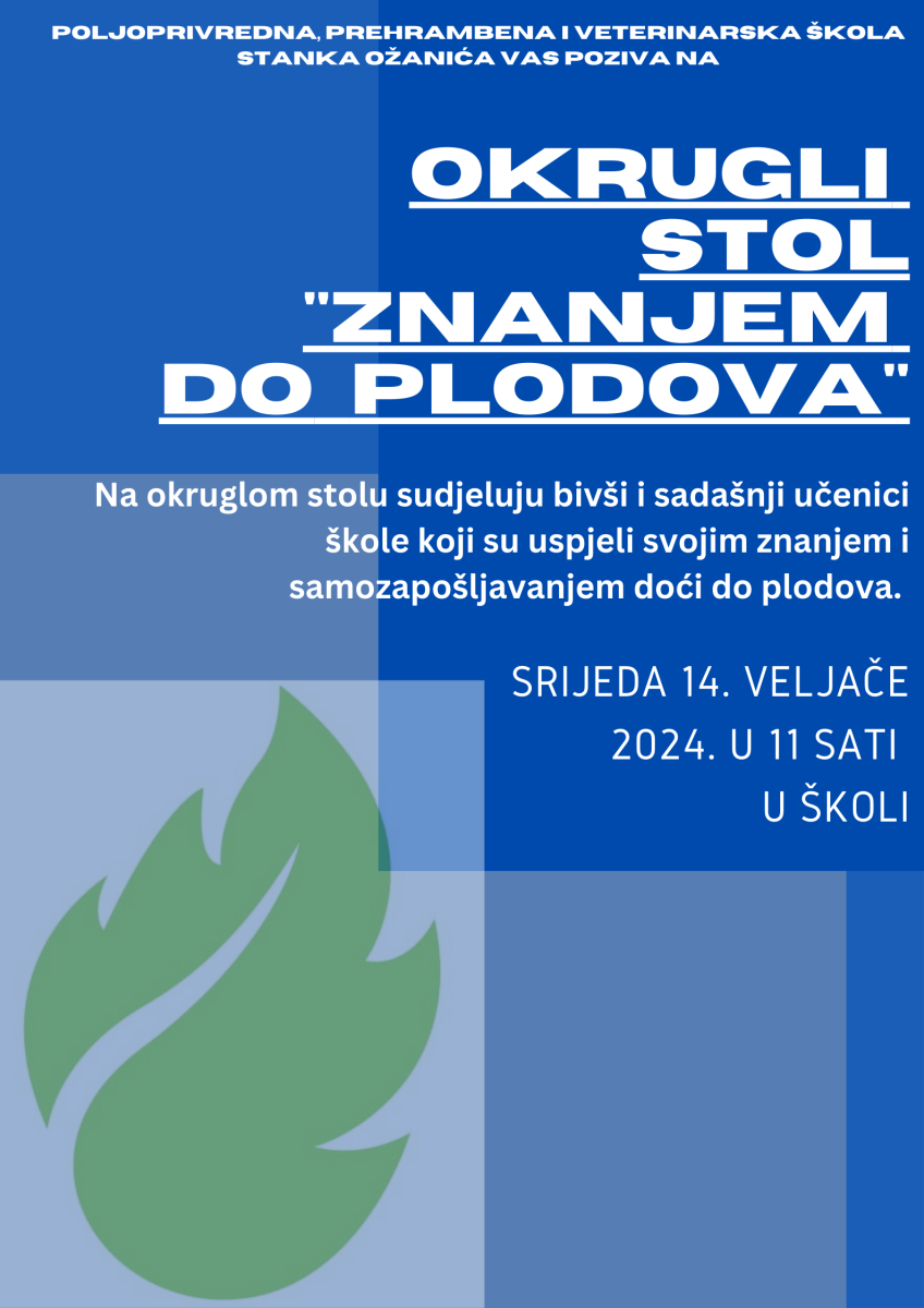 Jučer je održan 2. Okrugli stol „Znanjem do plodova“ u Poljoprivrednoj, prehrambenoj i veterinarskoj školi Stanka Ožanića Zadar. Na okruglom stolu sudjelovali su bivši i sadašnji učenici škole te roditelji sadašnjih učenika koji su uspjeli svojim znanjem i samozapošljavanjem doći do plodova.