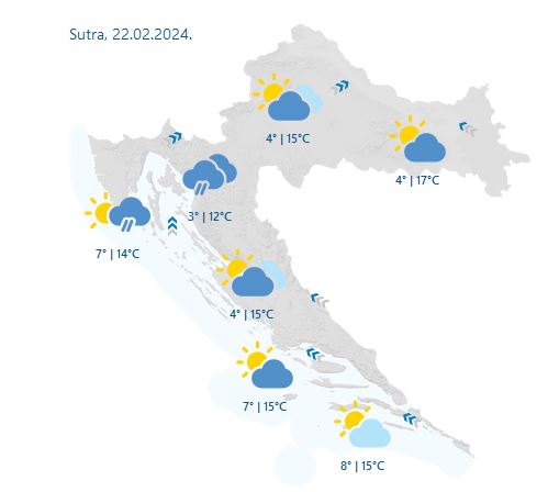 U petak sve oblačnije i vjetrovitije, povremeno s kišom koja će obilnija i češća biti na Jadranu i u gorskim krajevima. U unutrašnjosti umjeren i jak jugozapadni vjetar, na Jadranu jako jugo s olujnim udarima.