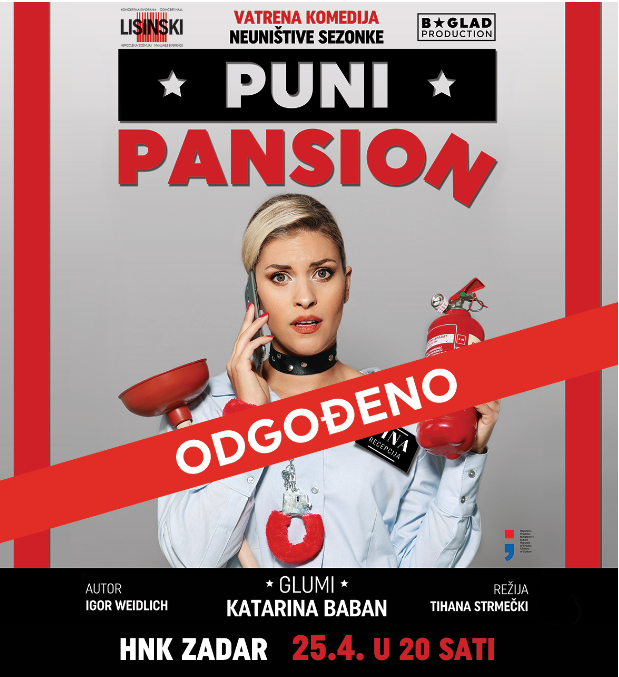 Večerašnja izvedba komedije “Puni pansion” u HNK Zadar odgađa se zbog bolesti glumice. O novom terminu posjetitelji će biti naknadno obaviješteni.