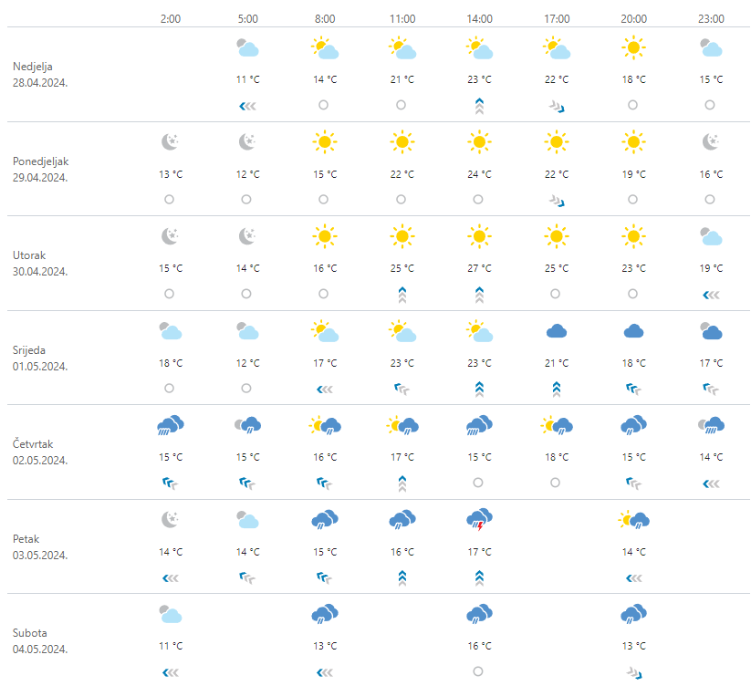 Pretežno sunčano, toplo i vrlo toplo. U srijedu uz umjeren razvoj oblaka mjestimice su mogući kratkotrajni pljuskovi. Vjetar slab do umjeren jugozapadni, na Jadranu jugo.