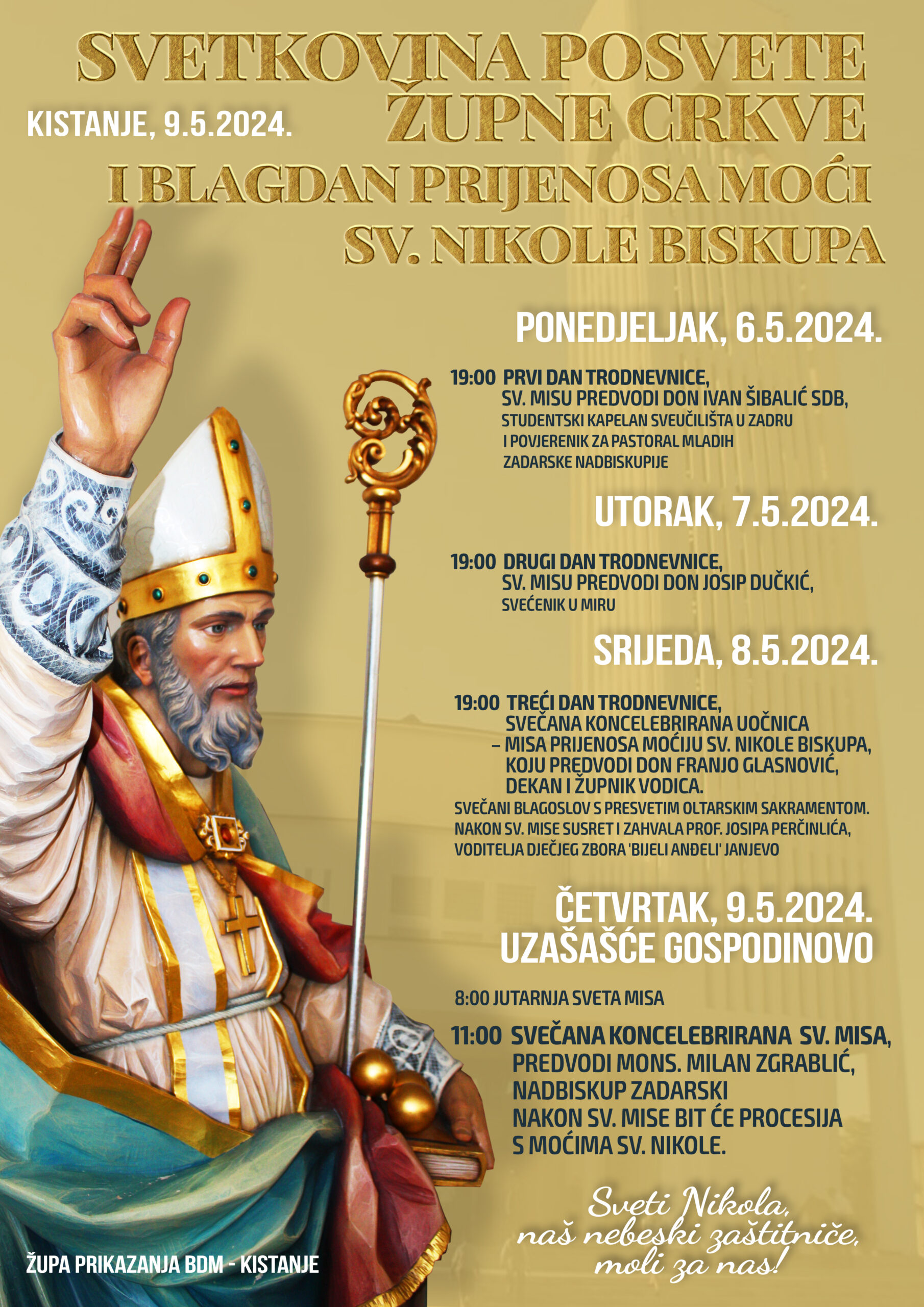 Na blagdan Prijenosa moći sv. Nikole biskupa, ujedno i svetkovinu 17. godišnjice posvete župne crkve sv. Nikole u Kistanjama, svečano koncelebrirano misno slavlje u četvrtak, 9. svibnja, u župnoj crkvi sv. Nikole u Kistanjama s početkom u 11 sati predvodi zadarski nadbiskup Milan Zgrablić. Nakon mise, mons. Zgrablić predvodi i procesiju s moćima sv. Nikole biskupa.