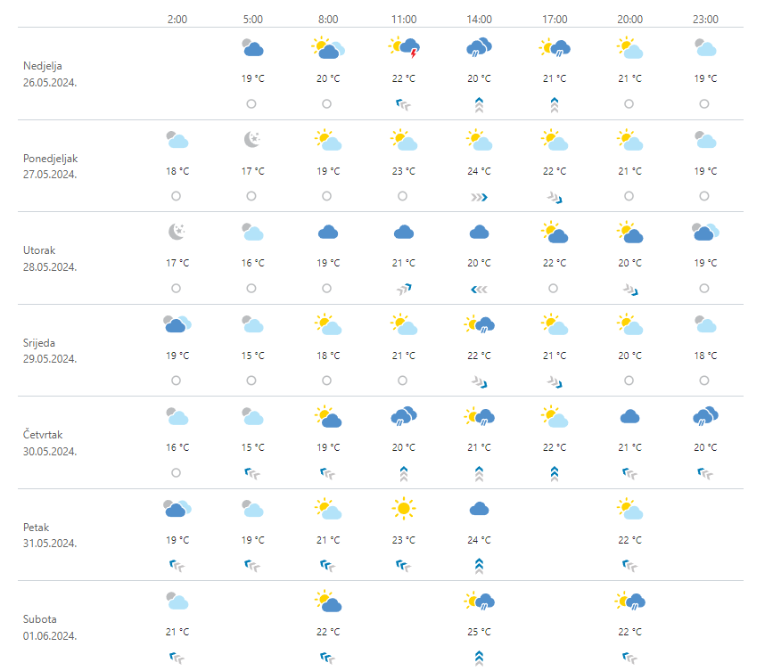 U ponedjeljak većinom sunčano, osobito na Jadranu. Poneki je pljusak ili malo kiše moguće uglavnom u Gorskoj Hrvatskoj te u unutrašnjosti Istre i Dalmacije. U utorak promjenljivo oblačno sa sunčanim razdobljima, ponegdje kiša i grmljavina, najviše sunca na istoku. U srijedu djelomice sunčano, mjestimice kiša te grmljavina, a vjerojatnost za oborinu najmanja na sjevernom dijelu Jadrana. U jutarnjim satima u pojedine dane na kopnu moguća magla. Vjetar u unutrašnjosti većinom slab, ponegdje umjeren sjeveroistočni i sjeverozapadni. Na Jadranu slab i umjeren jugozapadnjak i sjeverozapadnjak, u ponedjeljak i srijedu u jutarnjim satima mjestimice uz obalu bura, uglavnom na sjevernom Jadranu. U unutrašnjosti toplije nego u nedjelju, a na Jadranu će se zadržati podjednaka temperatura.
