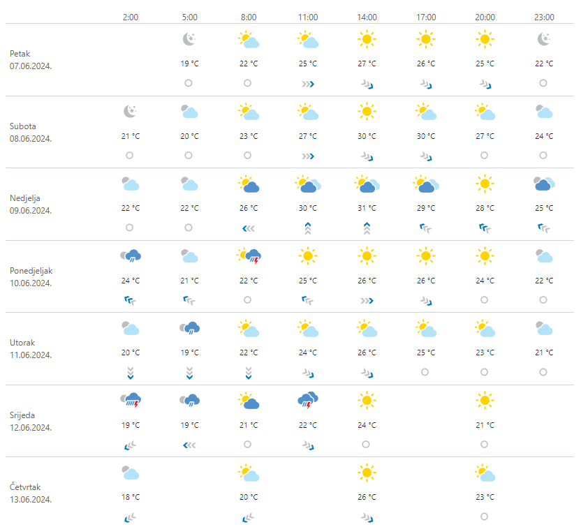 Pretežno sunčano i često vruće. U unutrašnjosti i na sjevernom Jadranu ne posve stabilno, moguć je poneki pljusak, osobito početkom i krajem subote, pa onda češće u ponedjeljak. Vjetar slab, od nedjelje umjeren jugozapadni. Na Jadranu slab do umjeren vjetar s mora pa od nedjelje umjereno jugo.