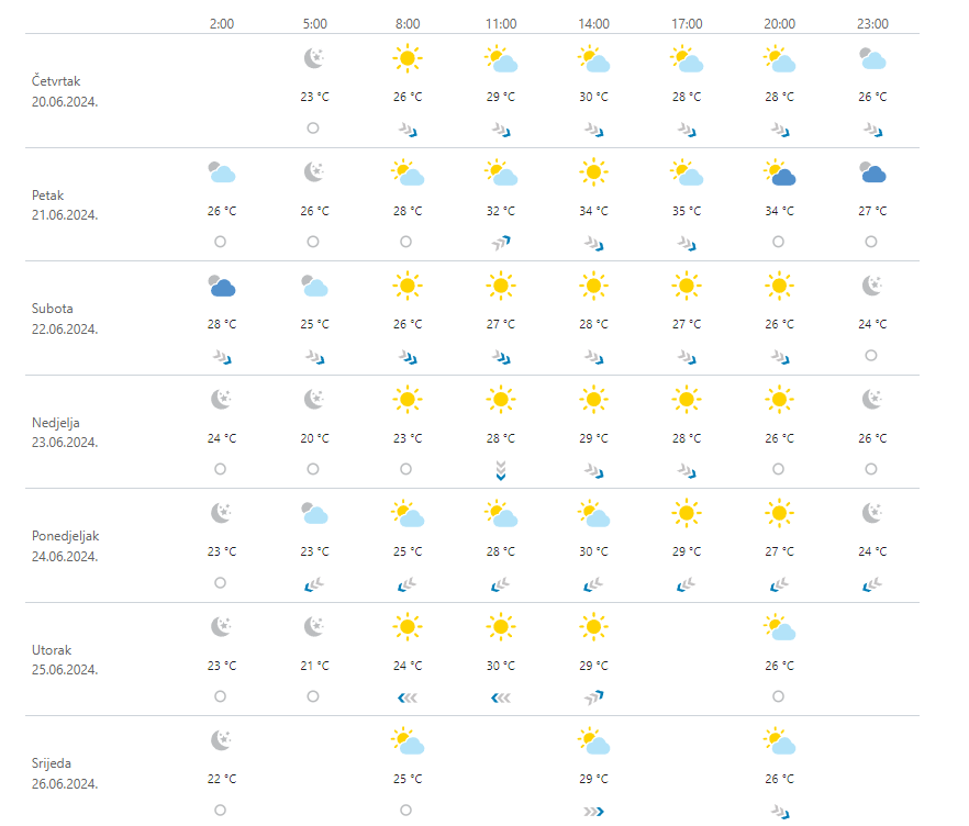 Prevladavat će sunčano, povremeno uz umjerenu naoblaku. Za vikend na kopnu i na sjevernom Jadranu povećana je vjerojatnost za pljuskove praćene grmljavinom. Vjetar u petak većinom slab jugozapadni, za vikend umjeren sjeverni i sjeveroistočni, duž obale sjeverozapadni. U petak najtoplije uz dnevnu temperaturu od 35 do 40 °C, za vikend dnevna temperatura niža.