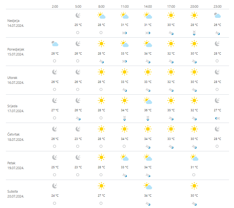 Pretežno sunčano, vruće i vrlo vruće, na kopnu ne posve stabilno, osobito u srijedu popodne može biti lokalnih pljuskova. Vjetar na kopnu većinom slab, ponegdje do umjeren sjeverni i sjeveroistočni. Na Jadranu će puhati sjeverozapadnjak i jugozapadnjak, u srijedu na sjevernom dijelu i bura. Noći će biti tople, uz obalu i vrlo tople.