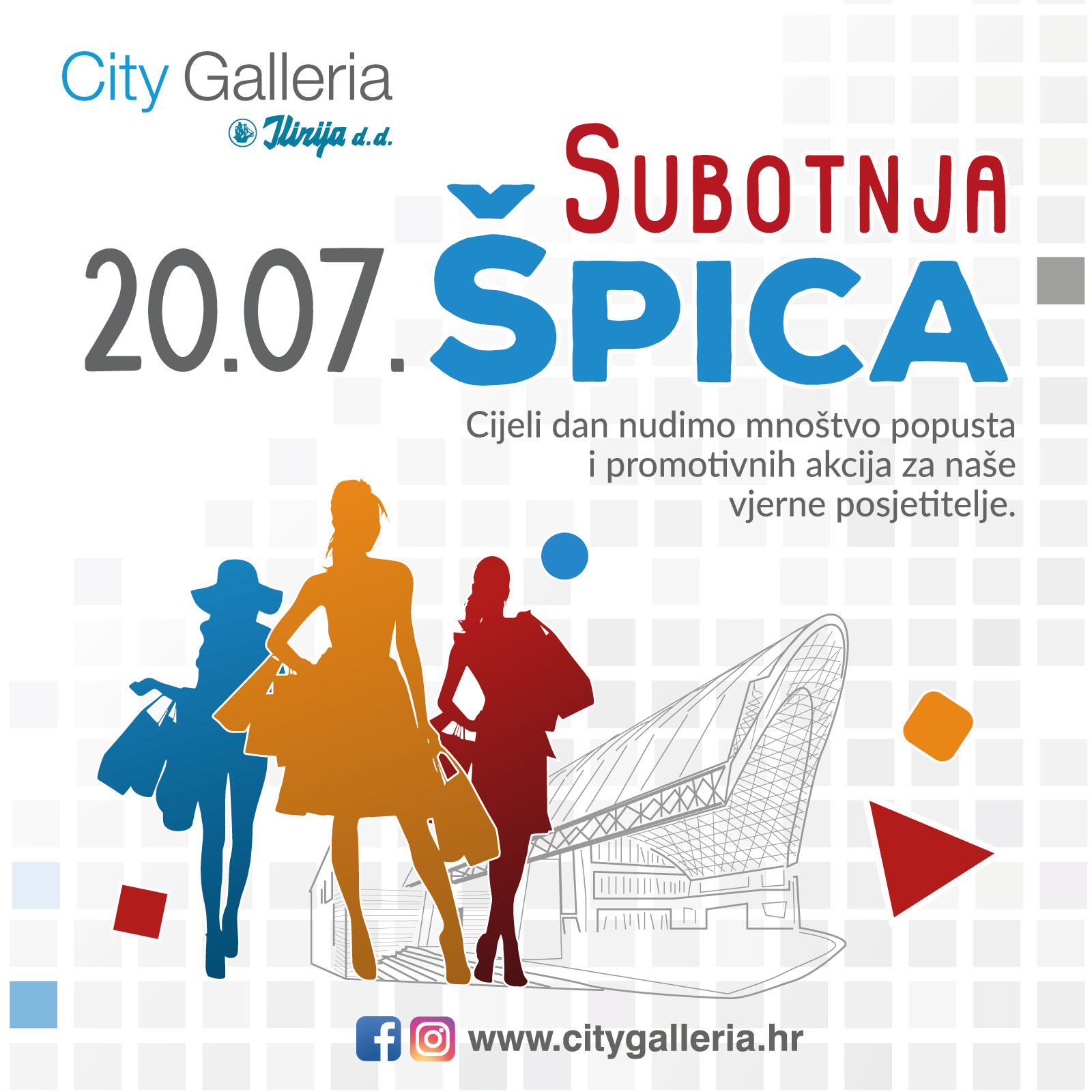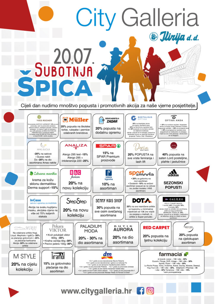 Ovu vruću ljetnu subotu 20.07. iskoristite za posjet centru City Galleria i rashladite se uz novu „SUBOTNJU ŠPICU” sa mnoštvom promotivnih akcija, popusta i SEZONSKIH SNIŽENJA!