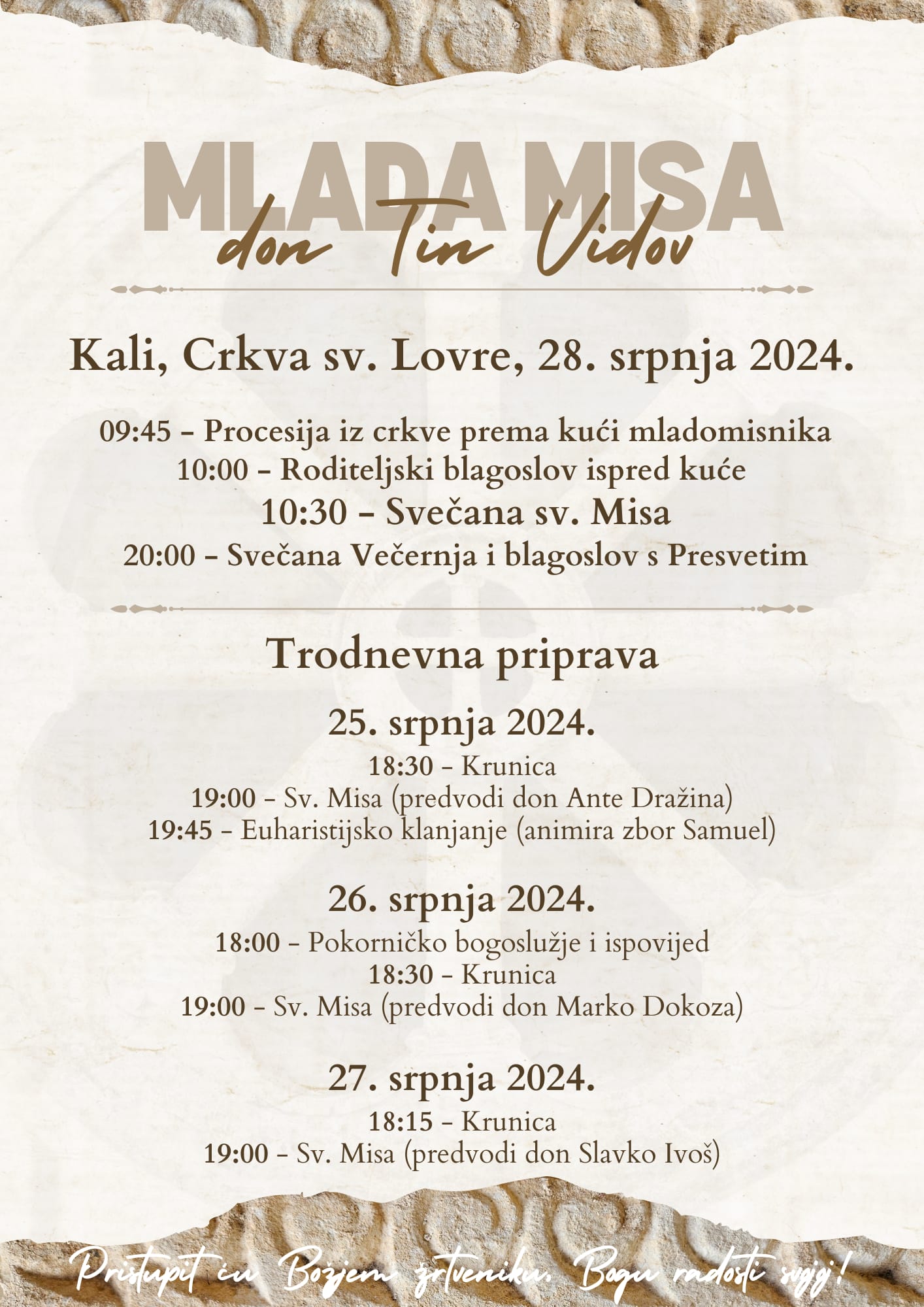 Trodnevna duhovna priprava ususret slavlju mlade mise počinje u župnoj crkvi sv. Lovre u Kalima u četvrtak, 25. srpnja, molitvom krunice u 18,30 sati, a u 19 sati će biti misno slavlje.