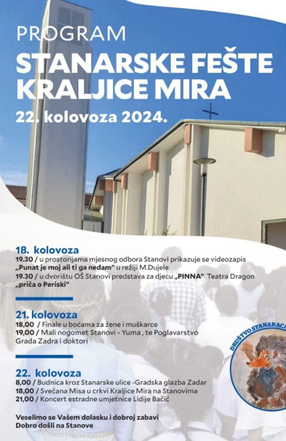 Blagdan Kraljice Mira u župi Kraljice mira na Stanovima u Zadru svečano se slavi u četvrtak, 22. kolovoza.