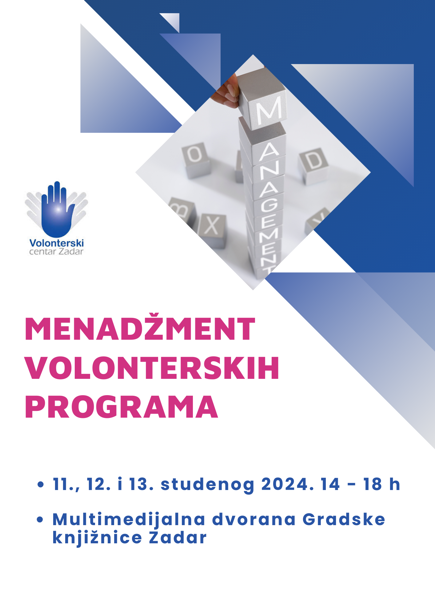 Edukacija će se održati 11., 12. i 13. studenog 2024. godine od 14 do 18 h u Multimedijalnoj dvorani Gradske knjižnice Zadar, Stjepana Radića 11 b, a provodit će je zaposlenici Volonterskog centra Zadar. Za dobivanje certifikata potrebno je sudjelovati na sva 3 dana edukacije.