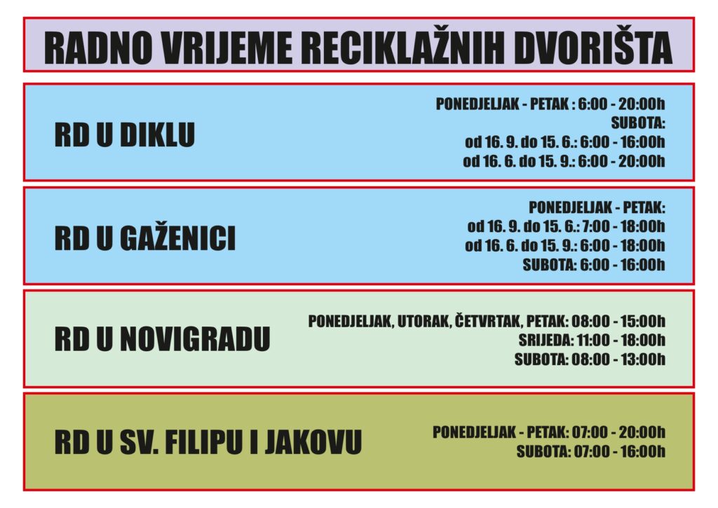 Reciklažno dvorište otvoreno je: (ponedjeljak – petak 06:00-20:00 sati, subotom 06:00-16:00 sati.